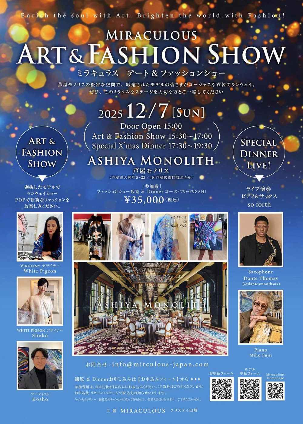 12/7(日)旧逓信省別館 芦屋モノリスにて、「芸術、ファッション、音楽で感性を高め、心豊かな明るい未来を!」をテーマに開催されるアート&ファッションショーにアーティストとして参加させていただきます✨